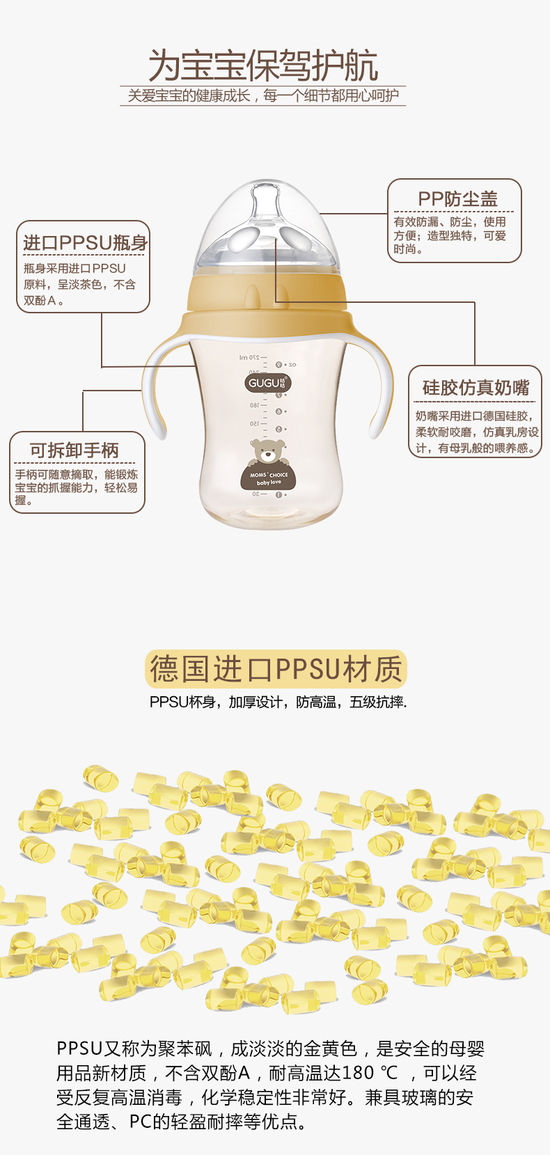 顏 色:都市灰/典雅黃/簡(jiǎn)約白 材 質(zhì):PPSU(奶瓶瓶身呈淡茶色)